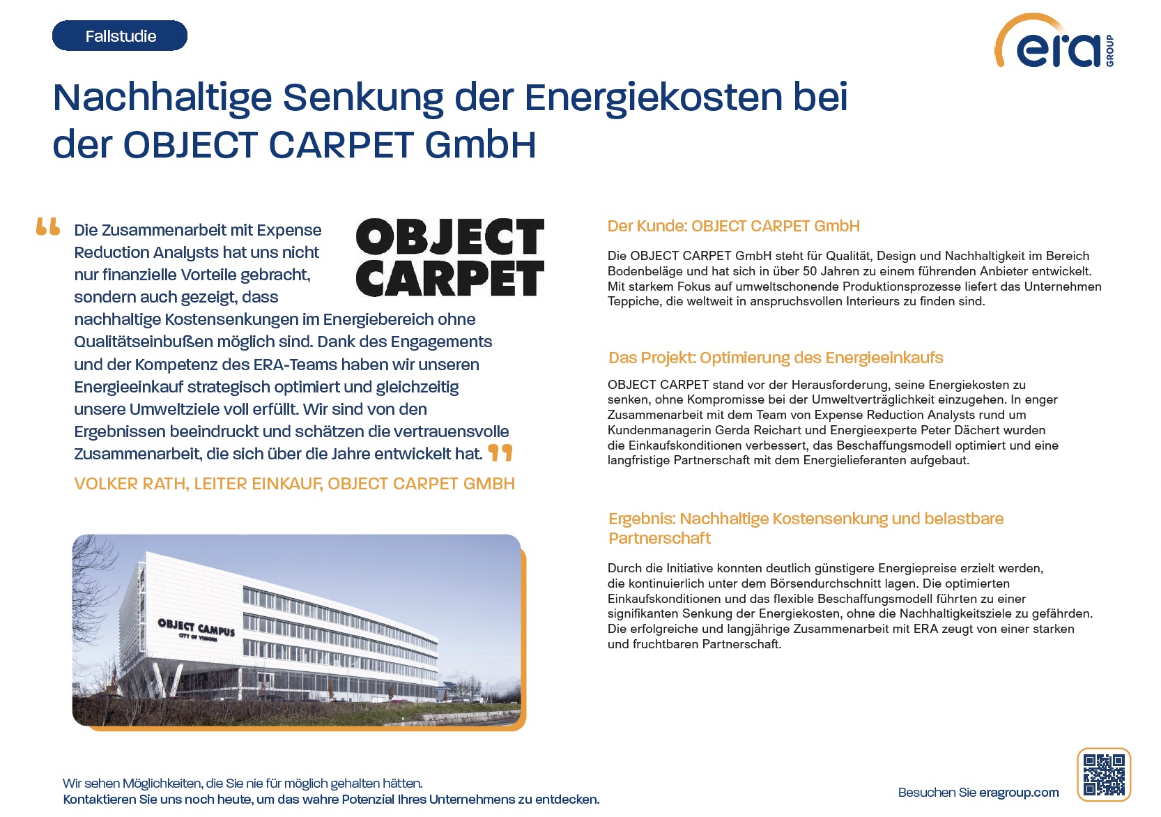 OBJECT CARPET GmbH, a leading provider of sustainable flooring, successfully reduced its energy costs in collaboration with the ERA Group. Through optimized purchasing terms and a flexible procurement model, the company achieved significant savings while maintaining its environmental goals. This sustainable initiative led to a resilient partnership and strategic optimization of energy procurement.