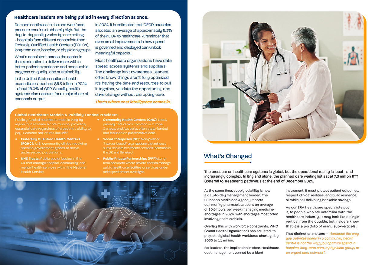 US national health expenditures reached $5.3 trillion in 2024 — approximately 18% of GDP. Across OECD nations, healthcare accounts for roughly 9.3% of economic output. Even small improvements in how spend is governed and deployed can unlock meaningful capacity. Yet most healthcare organizations are sitting on fragmented data: AP files, distributor reports, GPO documentation, and contract folders accumulated over years. Traditional reporting tells you what you spent. It doesn't tell you where the real opportunities are, or how to capture them without disrupting care.That gap is where cost intelligence operates. Unlike blunt cost-cutting, cost intelligence connects spend visibility with category expertise and clinical context — enabling leaders to prioritize, validate, and act on the right opportunities at the right time. ERA Group's healthcare specialists have worked across hospitals, FQHCs, long-term care, hospice, physician groups, and community health networks. Their insight is clear: healthcare looks like one vertical from the outside, but it's a portfolio of sub-verticals — and the way you optimize spend in a community health centre is not the way you optimize it in a hospice, a lab services network, or an urgent care group.This whitepaper explores where cost most commonly hides in healthcare — from clinical consumables and physician preference items to DME rentals and underutilized GPO arrangements — and how ERA's approach surfaces and captures those savings without compromising clinical standards or supplier relationships.