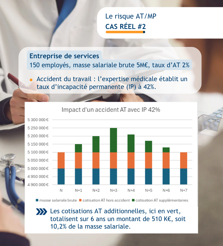 This is the least well known and therefore the least recognized by companies.In the event of an AT/MP, CARSAT will calculate an increase in the employer's contribution rate, the AT/MP rate. This rate is revealed when you receive the letter from CARSAT, and the bill can be very steep, with unexpected costs spread over up to six consecutive years.👉 What can you do? Once again, it is essential to ensure effective prevention of accidents and illnesses, but this is not enough: insurance solutions are also needed.💡 Before rushing into anything, you need to analyze your risks, see what is acceptable for YOUR company and then find the right balance between risks, cover and costs. Good to know: If you have fewer than 20 employees, you are subject to a fixed national AT/MP rate set by CARSAT.